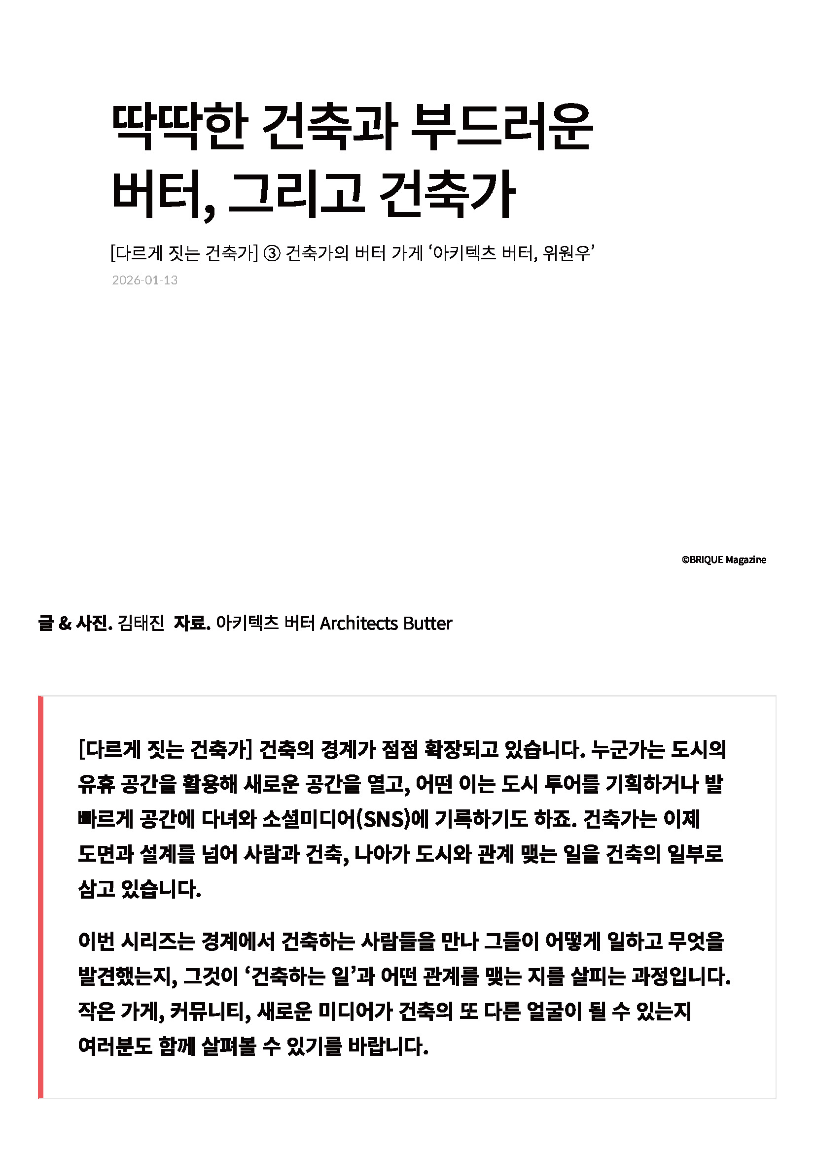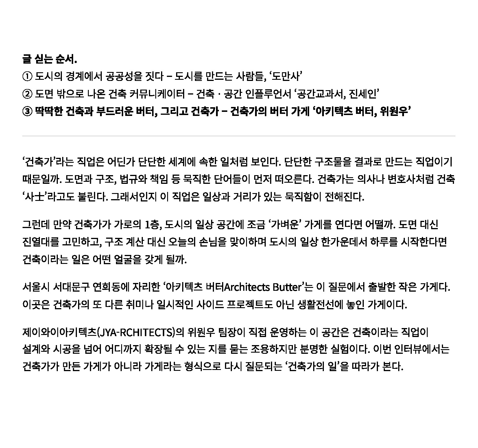 [다르게 짓는 건축가] ③ 건축가의 버터 가게 '아키텍츠 버터', 위원우 를 통해 소개되었습니다.
